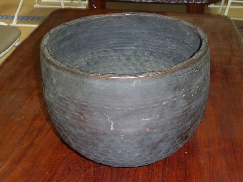 この鏧子は、鍛金(たんきん)技法といって、黄銅板を木鎚、金鎚や金床,当金などの道具を使って、焼きなまし加工をしながら根気よく打ち延ばし、鍛え上げて大きな鉢の形にしいてる。口縁は厚く胴より上は窄(すぼ)み、胴まわりから底部は鍛打ち跡が文様のように出来ている。