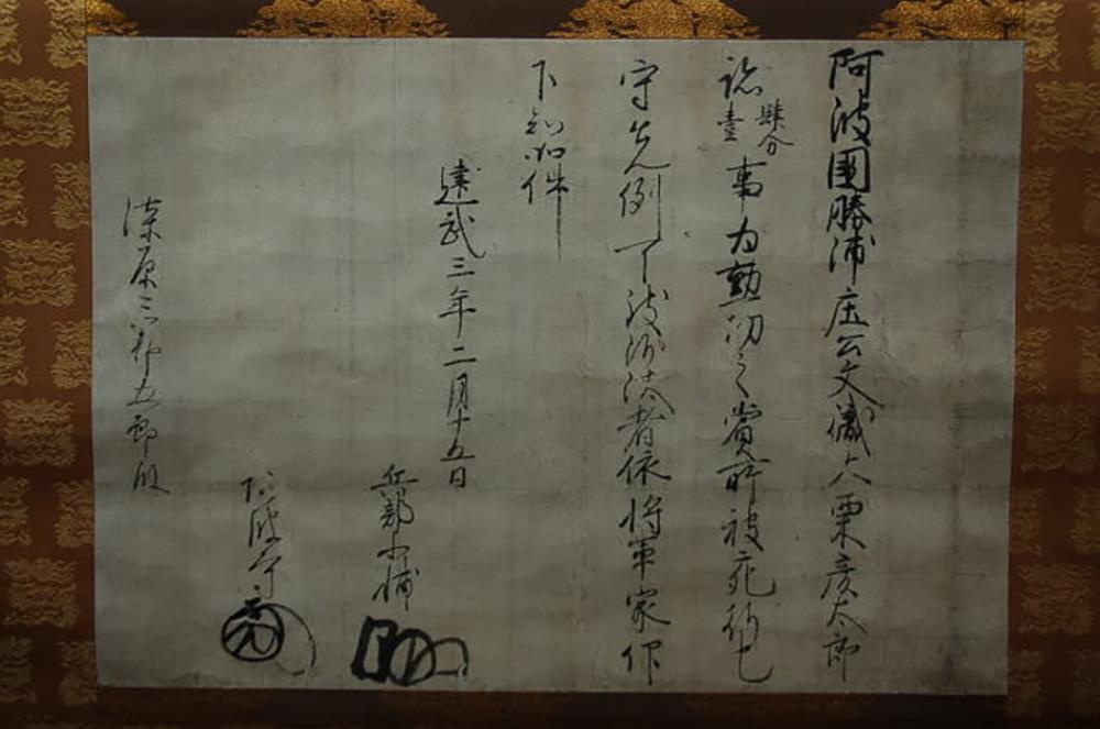 あて先の漆原三郎五郎は、板野郡富吉荘西方の地頭で、勲功の賞に勝浦荘公文職を宛がっている。