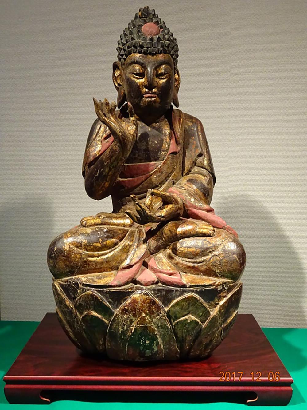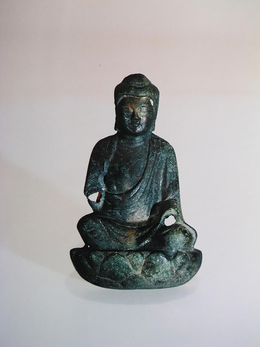 中国山西省交城県の中国の浄土教の最も由緒ある石壁山玄中寺にある七仏殿の中尊前に釈迦や菩薩が安置されている中の左右に座る釈迦像が最も古く元代(13世紀)の鉄仏がある、その像形がこの仏像に酷似している。