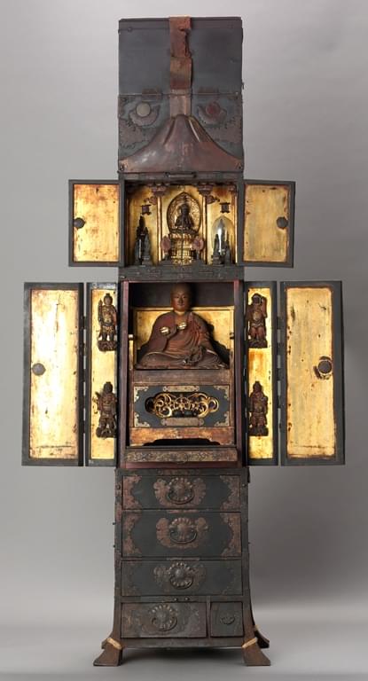巡礼行者が、札所・霊場を巡拝する時、仏像や書物物品を入れた笈を背負って行く。桐製で、弘法大師坐像、扉に四天王を設け、その上の中心に大日如来、左に弥陀三尊、右に薬師三尊、前に金仏の釈迦如来像四体安置。最上段に、富士山と日天月天、中央に仙元大菩薩の刻印の銅版が貼付。
