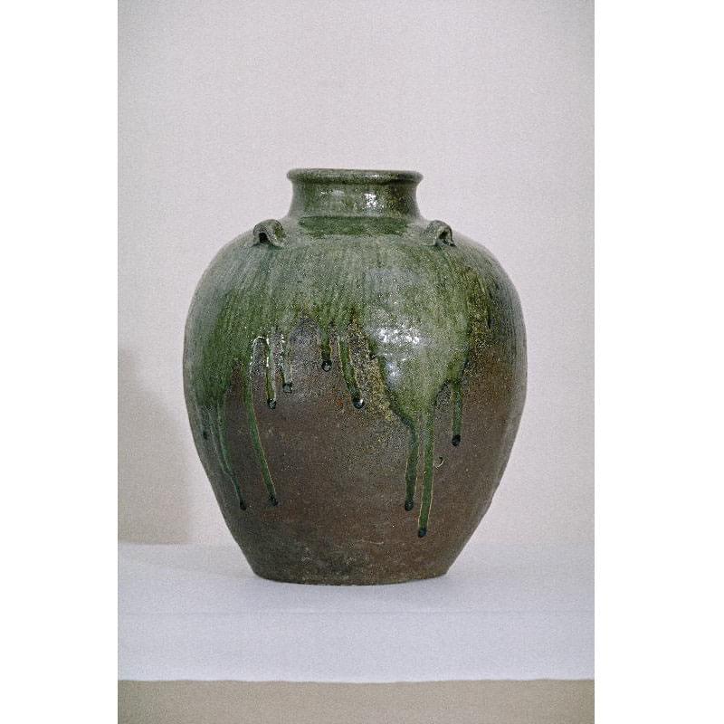 桃山時代以前の丹波の古陶。立杭(兵庫県多紀郡今田町)付近の三本峠・太郎三郎・源兵衛山・稲荷山などの山間の窖窯で焼かれた。主に無釉で大甕・壷・摺鉢などがある。この壷は紐土作りで、口は垂直に立上がり横に外反す玉縁状の口縁となり、肩は撫で肩で四耳をつける。胴は丹波焼き特有の猫かきがある。また、底部にロクロの軸受けの下駄印がある。肩から玉垂れになって流れちる自然釉(土灰釉)の青胡麻は見事である。