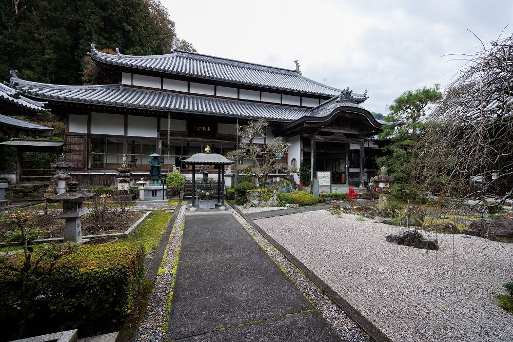 本堂は、天保4(1833)年建立。方丈、庫裡併設で東大寺を模して建立。本瓦葺、寄棟造。桁行13間(26m)、梁行6間半(13m)。鐘楼は、平成16(2004)年建立。3×3m、本瓦葺、入母屋造。