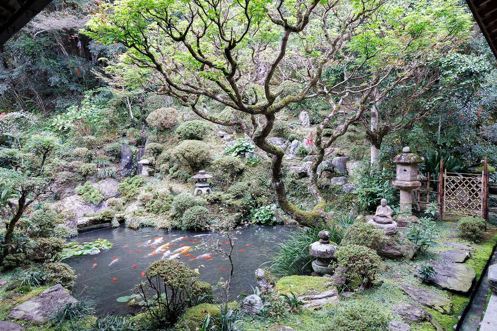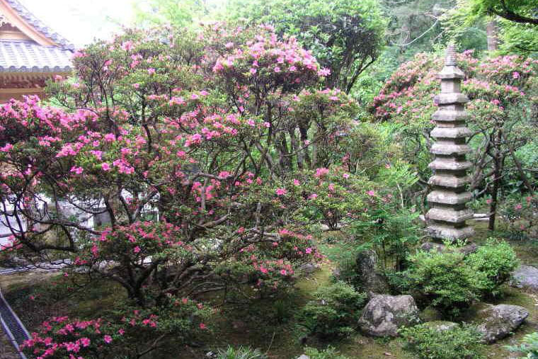 本堂裏には、滝と池の庭で、鎌倉時代の四方仏のつくばいと春日灯籠やシャクナゲがある。